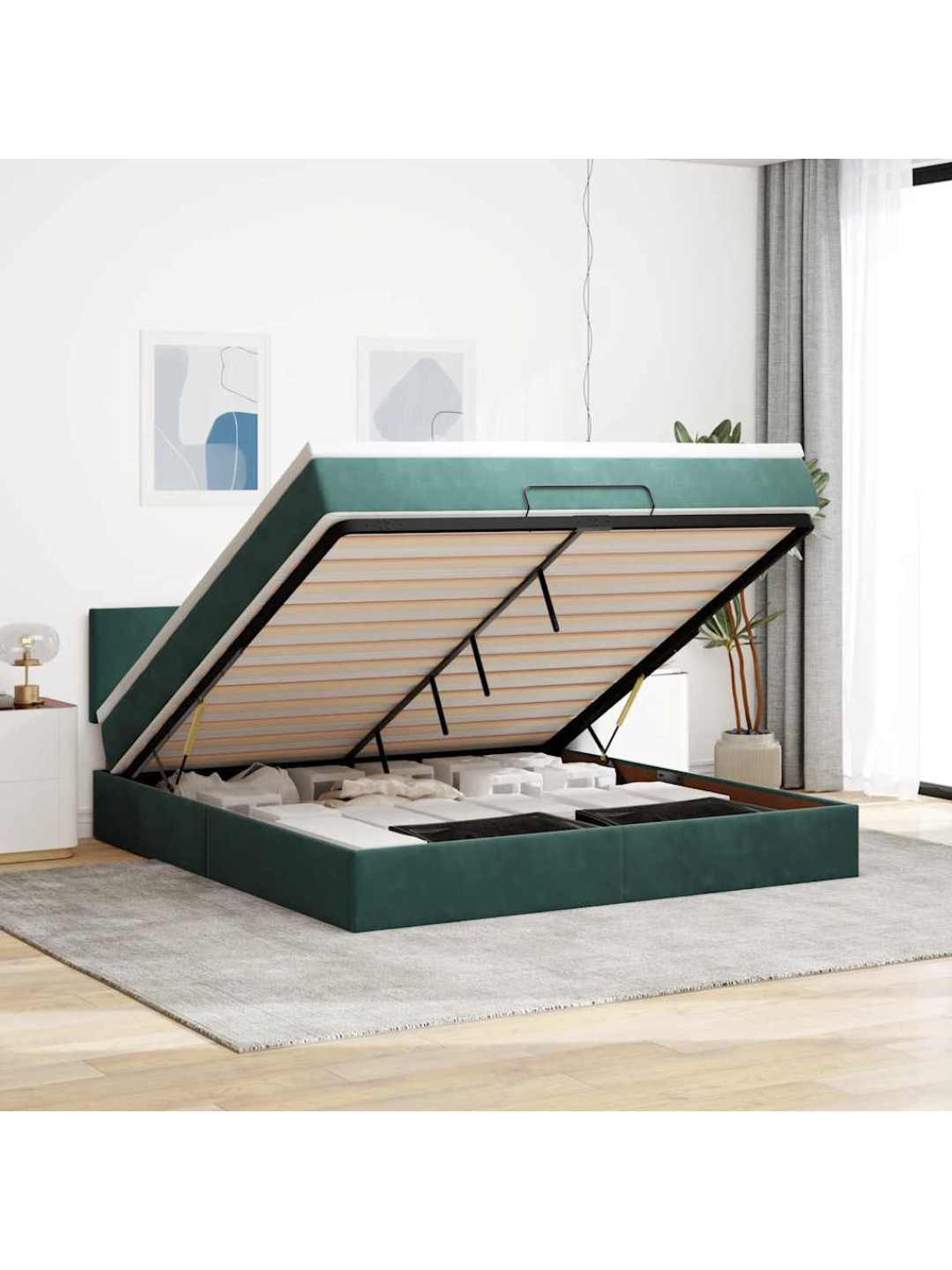 - Ruumikas voodialune panipaik: tänu hüdraulilisele tõstemehhanismile pakub voodiraam piisavalt voodialust panipaika, maksimeerides ruumi ilma täiendavat põrandapinda võtmata. Lihtsalt käepideme tõmbega tõuseb liistude alus sujuvalt, võimaldades teil oma esemed kiiresti ja vaevata kätte saada.